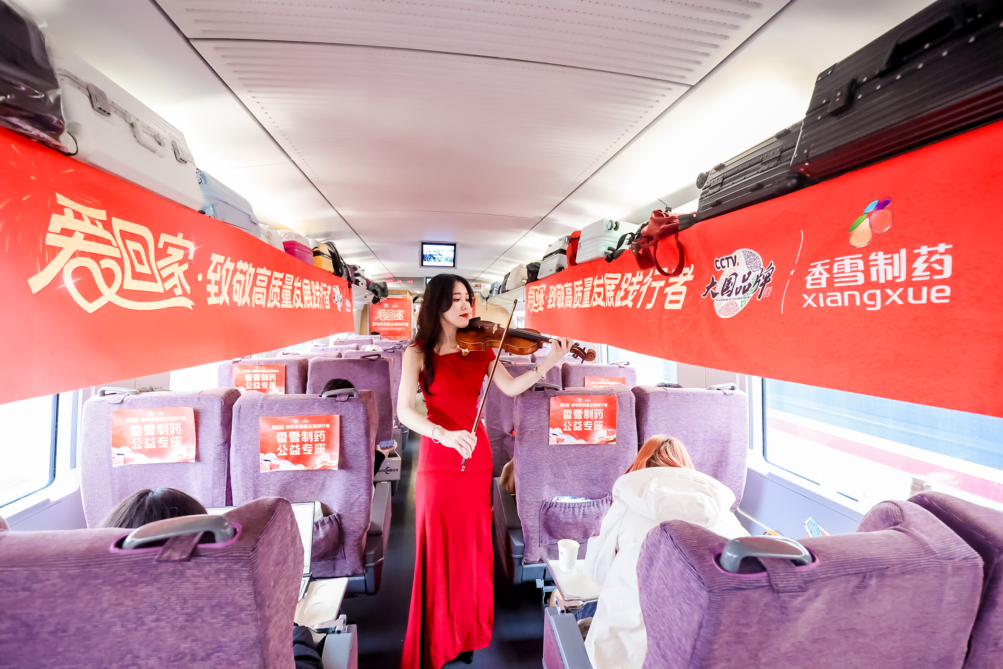 在这场奔赴亲情,共享美好的旅途中,一场场围绕着特色传统文化的互动在车厢内浓情开启。由志愿者用小提琴演奏的《孤勇者》,乐曲激昂有力,感染着每一位在场的践行者。“龙年龘龘”、“猪龙入水,八方来财”,人们手举着一块块写着对新年美好祝福的KT板,用手机的快门,留下过年前归乡的喜悦。