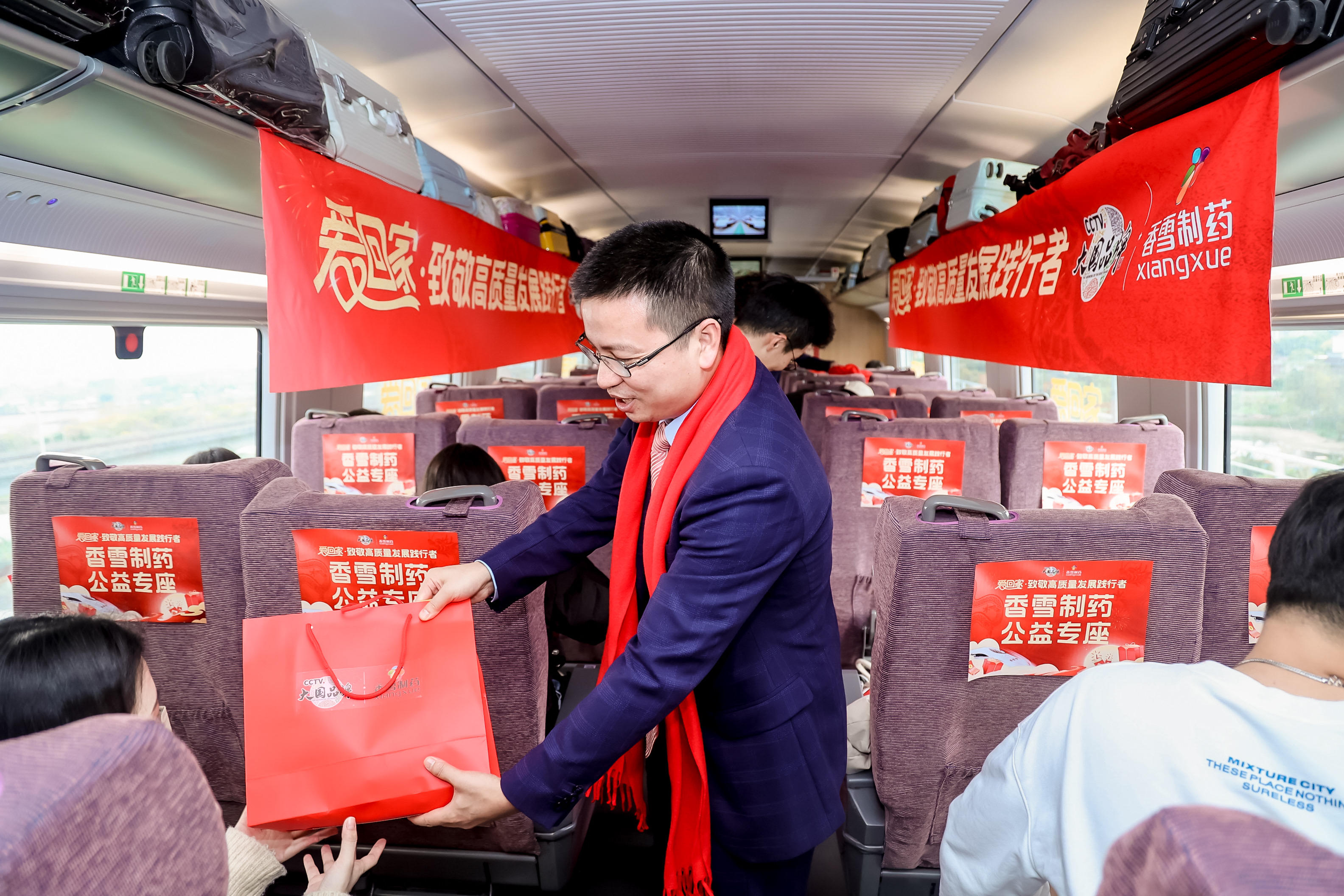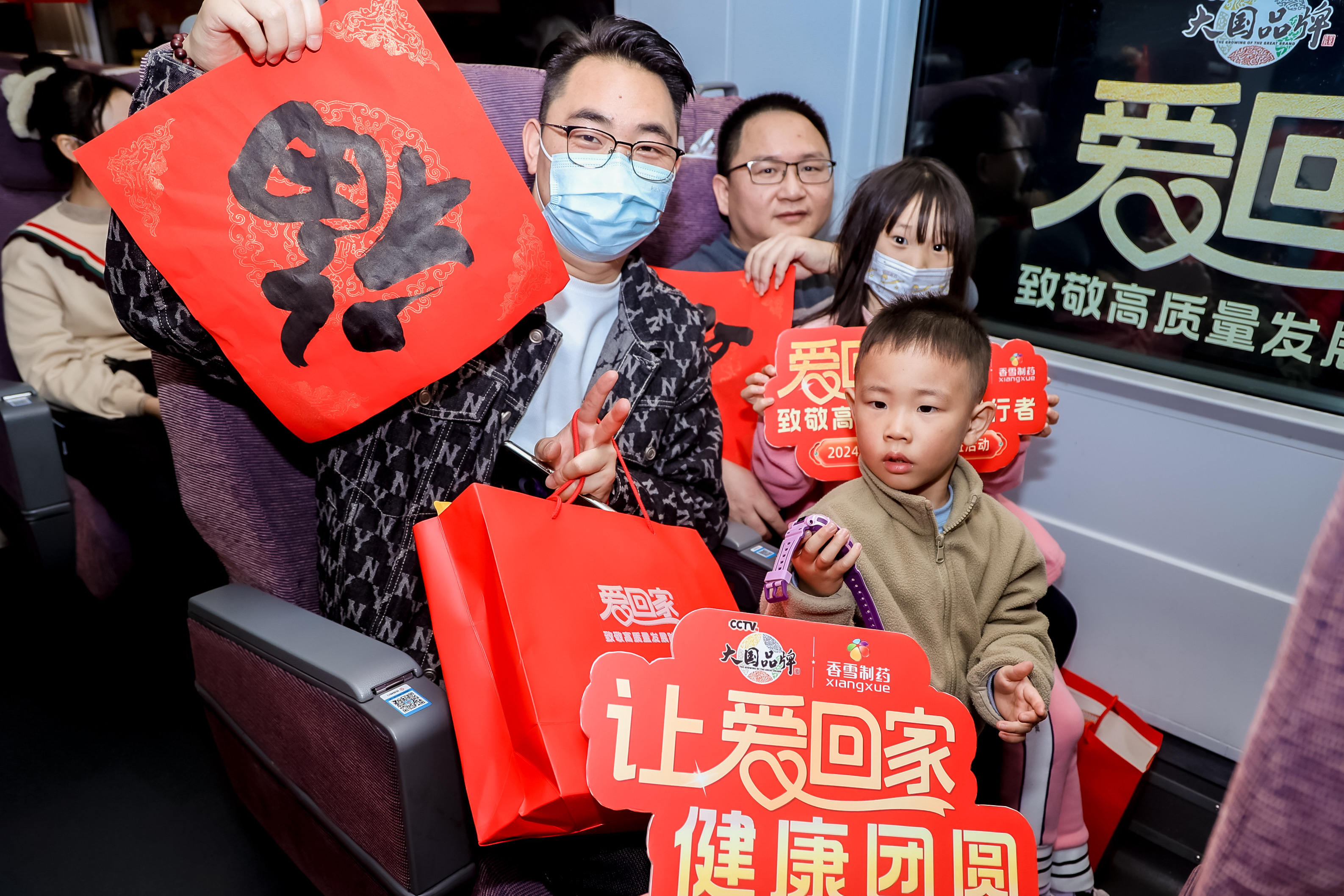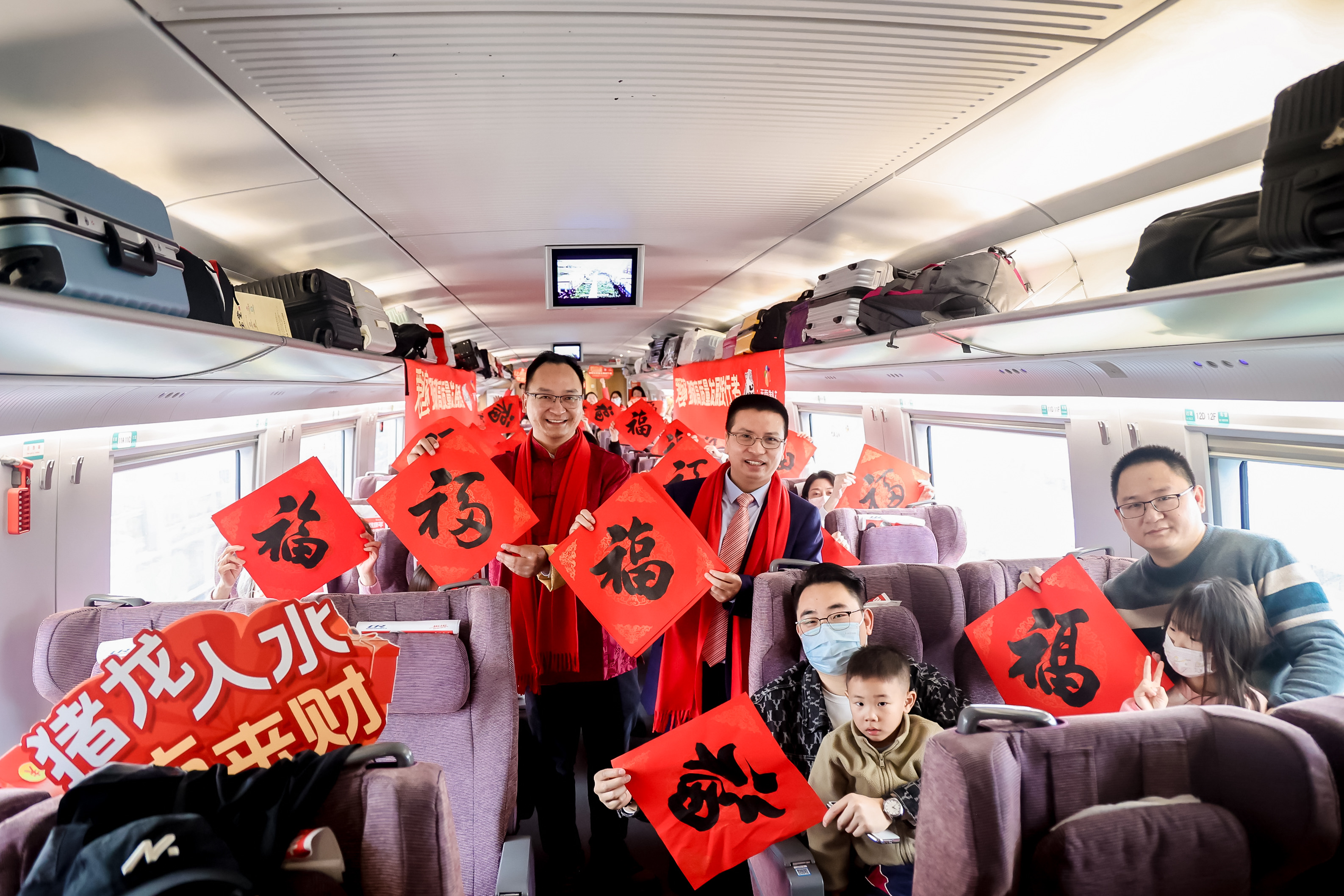值得一提的是,爱心专列发车当天正值南方农历小年夜,主办方精心布置了车厢,满溢着喜庆的窗花,象征团圆与美好的中国结,以及龙年主题的对联点缀其间,红色的视觉元素,让乘坐高铁的践行者们感受到浓郁的过年气氛,被爱和温暖所包围。304永利集团党委书记朱学艺在现场进行“金龙送福”挥春活动,将满满的福气和浓浓的祝福送给大家。