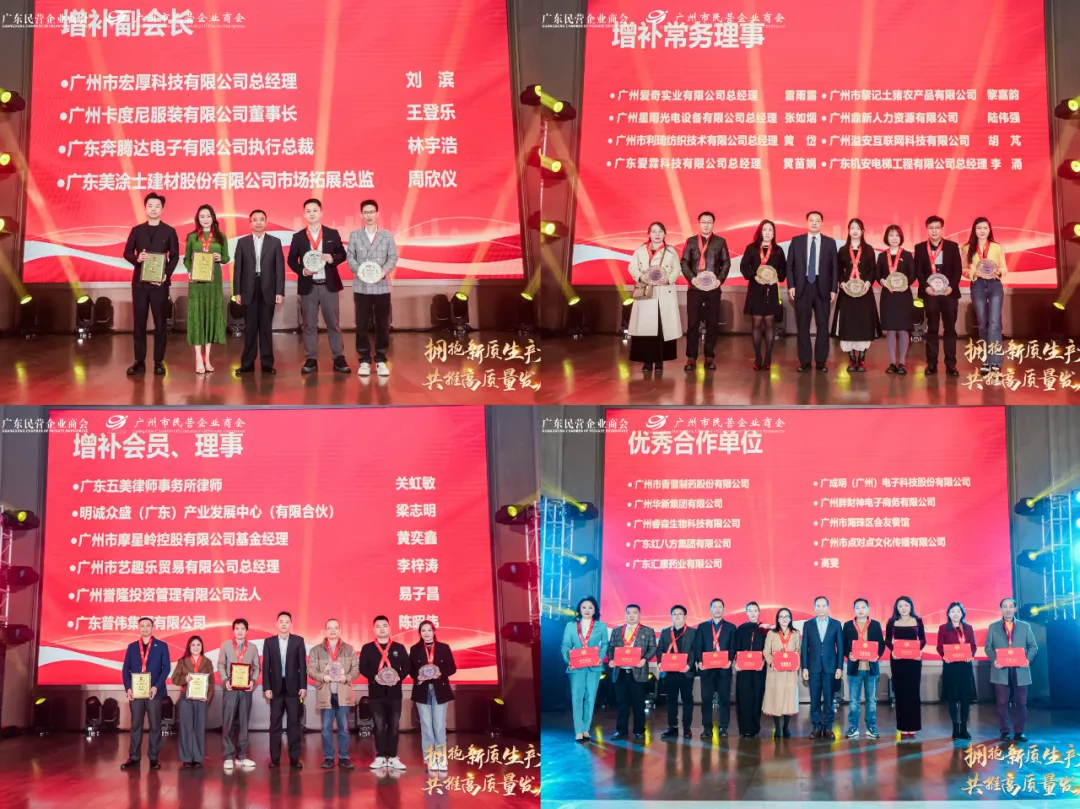 活动中为各位新增补会员、优秀贡献单位颁牌,广州市民营企业商会获颁广东省“四好”商会荣誉,304永利集团获颁“2024年度推动商会发展优秀合作单位”。