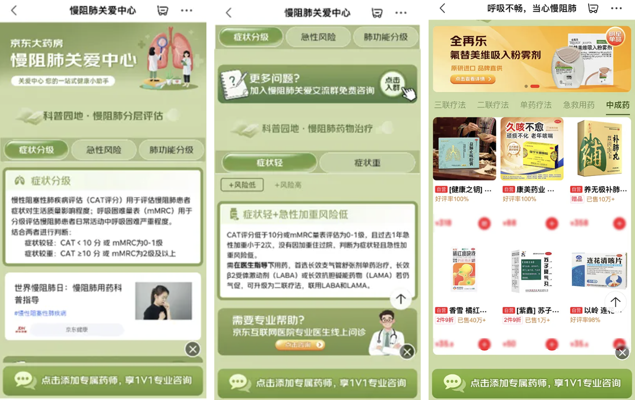 根据最新流行病学调查数据显示,我国慢阻肺患者人数接近1亿,其中40岁以上人群患病率达到13.7%,疾病负担相当沉重。面对这一严峻的公共卫生挑战,京东健康联合各合作品牌,构建覆盖科普、诊疗、康复全流程的慢阻肺健康管理服务体系。在药品供应保障方面,京东健康凭借全渠道覆盖的医药供应链,确保慢阻肺核心治疗药物的稳定供应。京东药师团队可为患者提供24小时实时在线的用药指导,帮助患者提升用药依从性,确保用药安全。同时,京东健康还与合作企业共同开展系列患者教育活动,通过专家直播、科普内容等形式,提升公众对慢阻肺的认知水平。