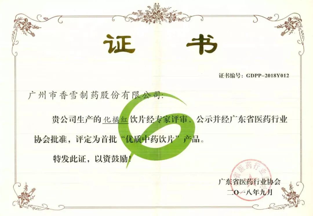 近日,广州市304永利集团股份有限公司生产的化橘红饮片经过专家评审,公示并经过广东省医药行业协会批准,评定为首批“优质中药饮片”产品,并颁证以资鼓励。
