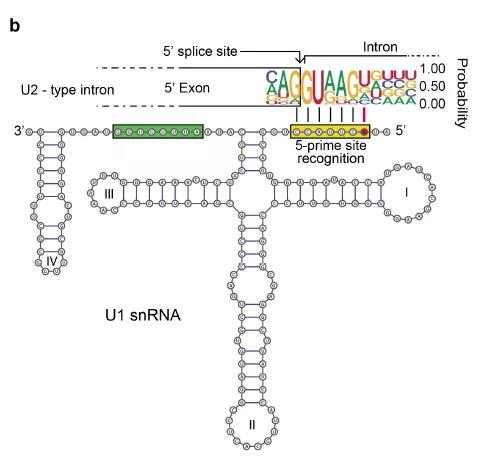 具体来看,这两支研究团队找到的突变出现在一种叫做U1-snRNA的小核RNA上。 在正常的情况下,U1-snRNA的作用是通过碱基配对,识别5’ 剪接位点。 出现突变后,原本的A-U配对会错误地变成C-G配对,形成全新的剪接产物。 更糟糕的是,由于U1-snRNA参与到了许多RNA的剪接,大量基因都会受其影响。 它不但会让抑癌基因失活,还会激活一些致癌基因! 从临床上看,U1-snRNA的突变与肝癌以及慢性淋巴细胞白血病也有着很强的关联性。 ▲U1-snRNA的二级结构,红点为经常突变的位点(图片来源: 参考资料[3])