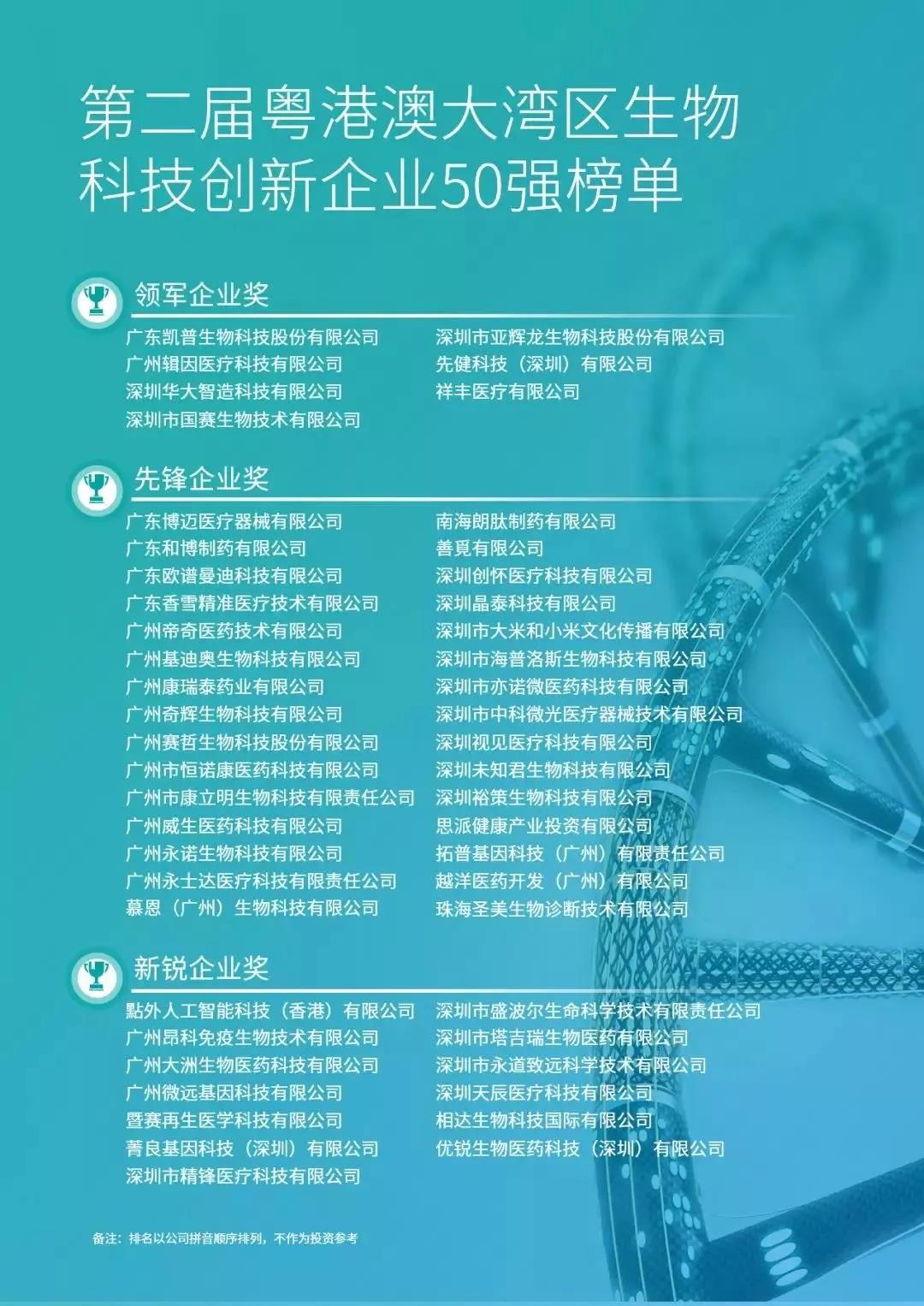 此次评选由政府机构、研究机构、投资机构、医疗机构等组成的权威专家评审团,根据企业生命发展周期划分,从创新技术、市场应用、资本三个维度,通过实地走访,与企业面对面座谈,全面评估参选企业的技术创新度和未来发展前景,最终确定了粤港澳大湾区生物科技企业50强榜单。